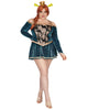 Transform into the most enchanting ogre with this Princess Ogre Plus Size Womens Costume. This royal costume features a deep green velvet dress with a luxurious black and gold jacquard front panel, off-shoulder design, and elegant gold trimming. Complete your transformation with a headband featuring a mini gold crown and charming green ogre ear hair clips. Perfect for channelling your inner princess like Princess Fiona from Shrek and bringing a touch of fairytale magic to any costume party.