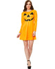 Slip into this Pumpkin Dress Womens Costume for a fun and easy costume for Halloween this year. This dress comes in an orange a-line design with long sleeves and a wide neckline. Printed across the front of the bodice is a black jack-o-lantern eyes, nose and smile.