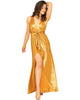 You'll be the queen of dance (and broken hearts) in this stunning 70s Golden Glamour Plus Size Womens Gown. Included is a sleeveless maxi dress with plunging V-neckline and sexy thigh slit in shimmering metallic yellow gold fabric. This dress creates a gorgeous silhouette, draping effortlessly from just below the bust to just above the floor, depending on the wearer's height. Also included is a sash belt in matching fabric to further define your waist. This item has been designed and made exclusively for CostumeBox, which means you won't find it anywhere else. Perfect for glamorous 70s parties, discos and festivals. You'll want to dance and twirl the night away–and probably steal the show in every photo–in this incredible dress!