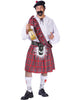 Not your ordinary tartan outfit, this Big Shot Scot Mens Plus Size Costume comes with the full kit and kaboodle including a white long sleeved shirt, a red tartan kilt with a shoulder sash, a black belt, a black hat with a red pom pom, sock tops/cuffs, a bottle holster and 4 shot glasses. What you wear underneath the kilt is your business. Perfect for your next Scottish party or International themed party.