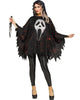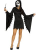 This highly recognised scary character, Ghost Face, can now be enjoyed in a glamorous way with this Scream Ghost Face Glam Womens Costume. This costume comes with a mini black dress with a jagged hem, large bell long sleeves and an attached hood around the back. There is an included white Ghost Face half mask to truly embody the character.