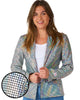 You can't go wrong with this Discoballer Opposuit Womens Jacket for your 70s look, especially if flares and jumpsuits aren't your style. This high quality opposuit jacket features a suit quality fully lined blazer with two front pockets, four inside pockets, padded shoulders a double-vented back, notched lapels and styled with mirror patches att over it to create a disco ball effect. Perfect for shining bright as you boogie all night long under disco lights.