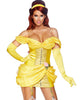 Dress a little sexy at your next ball wearing our Storybook Bombshell Women's Costume. Featuring a yellow princess mini dress with a sweetheart bustline, over-the-shoulder yellow sleeves, clear straps, styled with rose flower accents and attached with yellow garters at the hem. The costume also comes with a yellow headband. Great for Halloween or a fantasy-themed party! Finish the look with a pair of long yellow gloves, a red wig and stockings. A story as old as time!