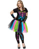 For a bright and colourful skeleton Halloween costume you can't go past the Funky Punky Bones Girls Costume. Featuring a dress with printed colourful skeleton and attached rainbow tutu, sleevelets, and footless black tights with printed skeleton bones. A colourful fright!