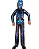 Don't dress as a boring old white skeleton this Halloween and show off some colour with this Neon Skeleton Boys Costume. This eye catching costume features a black jumpsuit with a printed image of a blue and purple neon skeleton with a galaxy like images behind it. There is an included headpiece which is a hood also with a printed image of a neon blue and purple skull. There are eye holes inside the headpiece, so you can see.