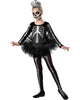 Dance 'til you're dead in this Skeleton Ballerina Girls Costume! Perfect for that budding ballerina who works herself to death to wear on Halloween! This funky costume comes as a black long sleeved leotard with printed white skeleton bone detail, matching black stockings with leg bone detail at the front, a black tutu and also a skeleton bone crown to top off the costume! To copmlete the costume, simply grab some black and white makeup and create your own skull face!