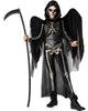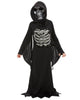 Let your little one embody the spirit of death itself with this Skeleton Reaper Boys Costume. This haunting outfit features a long black robe with a jagged zig-zag hem, creating a look that’s straight out of a nightmare. The long sleeves are adorned with eerie drapes, giving a ghostly flow to every movement. The chest showcases a terrifying ribcage detail intertwined with skulls, adding a bone-chilling touch to this grim costume. Topping it off is a black hooded skeleton reaper mask, ensuring your child is ready to send shivers down spines this Halloween. Beware—when the reaper comes knocking, it’s already too late.