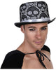 Add some spooky elegance to any outfit with this Skull Top Hat Black and White. Included is a top hat with black brim, white sash and a black and white lace skull print, perfect for Day of the Dead or any number of Halloween costumes.