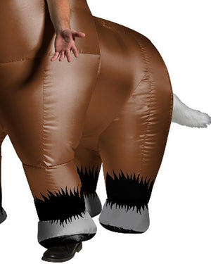 This Mr Horsey Horse Inflatable Adult Costume is perfect for a bit of fun at your next sports party, animal party and more. The costume is styled as a large brown horse with a fluffy black mane, and tail. The costume easily inflates with the included battery operated fan (4 x AA batteries are required and not included) and features elasticated shoulders and ankles to keep the air in, as well as a clear vinyl panel across the face to see through. Giddy-up Mr Horsey, it's time to hit the racetrack!