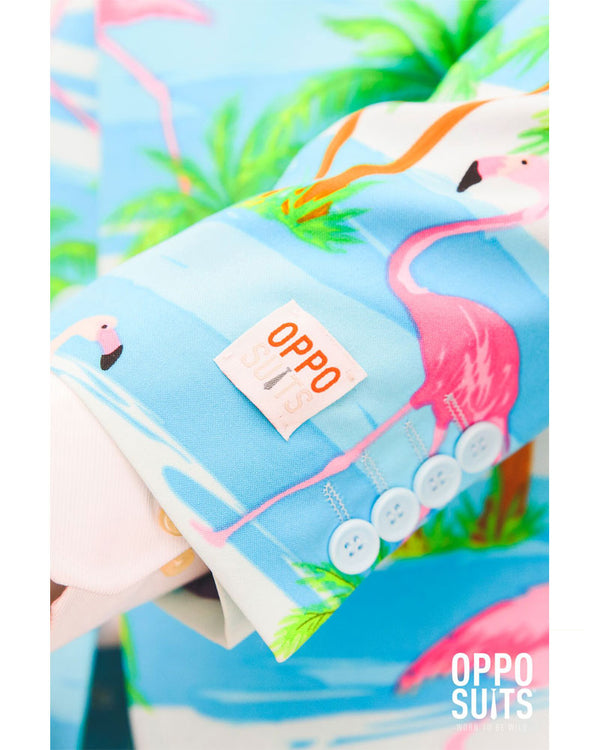 You'll have everyone at the office gawking with wonder in this classic Opposuit Flaminguy Premium Mens Suit! This Opposuit features a jacket, pants and a tie and is printed with palm trees and flamingos. This suit is made from high quality material and is designed to fit, look and feel like a regular suit, only more stylish. The jackets are equipped with inner lining, inside pockets and pockets on the front, while the trousers have pockets both in the front and in the back, the back pockets with buttons for closure. Perfect for wearing to the office, a wedding or the weekend races. Simply add your own shirt and you’re good to go! If you’re unsure about sizes we recommend picking the larger size of the two suits as they come in a slim fit. All Opposuit pants and jackets are lined with a small amount of additional fabric so that if desired, they may be tailored to your exact length and fit by an alterations business or tailor. Also, the waistband of trousers can be adjusted 2 sizes larger or smaller than the original size.