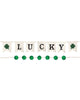 - Banner with off-white burlap pennant spelling 'LUCKY' with two green clovers.