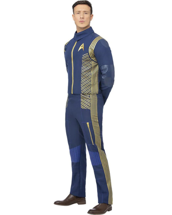 Embrace your inner Starfleet Commander with our Star Trek Discovery Command Uniform Mens Costume. The costume includes a blue long-sleeve collared top featuring authoritative gold accents and the iconic Starfleet emblem, based on the uniform worn in the series, making you look ready to explore the mysteries of the galaxy. The matching pair of pants ensures a cohesive and comfortable fit, so you can focus on your mission without any distractions. Perfect for die-hard Trekkies and sci-fi enthusiasts for the next convention or themed party.