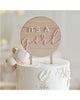 - Wooden circle “it’s a girl” cake topper with two spikes.