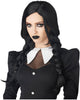 This Morbid School Girl Womens Costume will help channel your inner gothic rebel. The dress comes in a black long sleeve and features a small white flower print. There are black buttons down the bodice, a large white collar and cuffs at the sleeves. The sleeves are long with puffed shoulders. Pair this dress with a long black wig with two plaits, and a pair of black shoes to embrace the unblinking, no-smiling character.