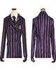 Transform yourself into a man of business... perhaps supernatural business in this Evil Business Man Mens Costume. This costume features a black and purple vertical striped blazer-style jacket. Printed on the chest is an academy crest, four black buttons at the front and two pockets at the sides. Pair this jacket with a white shirt, black tie and a black pair of pants. A charming style with evil intent.