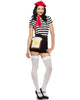 Keep your crew in line all the while dressed as a cheeky pirate captain in this Captain Hunk Mens Costume ensemble. This edgy costume includes a red bandana, a short navy blue vest with an upturned collar and gold epaulettes. There is a brown belt with an attached gun holster, a red sash, a pair of navy blue and white striped short shorts and a pirate prop sword. This is not a costume for the faint hearted. Complete the costume with other accessories from our pirate range. Perfect for Costume parties, Themed parties and much more.