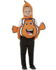 This super adorable Clown Fish Toddler Costume is a classic and colourful dress-up for tiny tots. The clownfish, popularised by the iconic 2003 movie Finding Nemo, is encapsulated in this costume as a wearable, stuffed, 3D fish in the colour Princeton Orange, with large white stripes and small black stripes – just like a real clownfish! The hood of the costume is matching orange and acts as the top fin of the fish. The front of the costume features a cute printed cartoon fish face in black and white. Perfect for kids' parties, sea creature dress-up events and movie nights. Now all you need is to find a Royal Blue Tang fish friend!