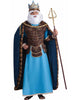 Cause some waves under the sea in our King Neptune Mens Costume. This majestic costume includes a regal tunic top made of a dark rainbow fish scale print with an attached purple metallic fake belt. The belt features a striking gold seashell accent on the front. There is a long metallic purple flowing cape, complete with a stand-up collar shaped like fish fins. Top the look with the satin gold crown headpiece, adorned with faux purple jewels fit for a sea king. Complete the outfit with gold foam gauntlets for an authentic under-the-sea adventure. Perfect for making a splash at any costume event.