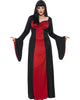 Search for your next victim in style when you wear this Bloodthirsty Vampire Womens Costume. The costume includes a floor length dress with black lace up bodice with red sweetheart neckline and attached red satin stand up collar. The skirt of the dress is in a red flowing fabric.