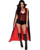 Search for your next victim in style with this Gothic Vampire Womens Costume. Included is a black velour long sleeve jacket with lace cuffs, red zip up centre panel, gold front paneling and red ruffle shoulders. The neck of the jacket also features a cutout design. Attached to the jacket is a red and black cape with high collar.