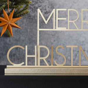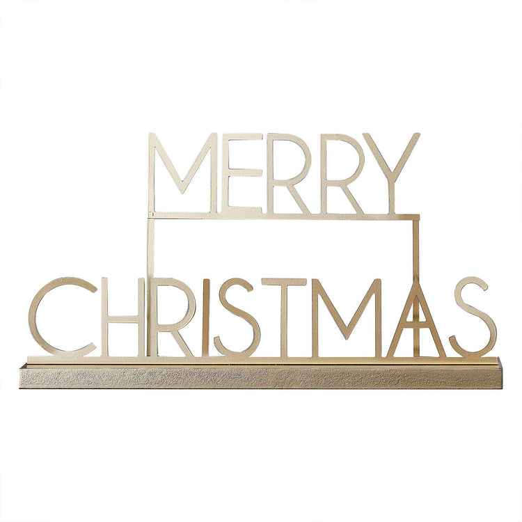 Your festive decor will shine ever so bright with this Cosy Copper Gold Metal Merry Christmas Sign. Crafted from gleaming gold metal and set on a gold wood base, this timeless piece effortlessly blends festive cheer with modern sophistication. Perfect for mantels, shelves, or tables. Pair with other pieces in the Cosy Copper range to elevate your decorative scene.