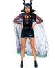 Step into the realm of twisted enchantment with our Elite Dark Queen of Hearts Womens Costume. This mesmerising ensemble is designed for those who embrace the allure of darkness and revel in their regal power. The costume features a black peplum bodice with contrasting red accents to exude an air of authority and sophistication. With its off-shoulder puffs and long lacy sleeves, this bodice adds a touch of dark allure to your presence. The attached cape, featuring a faux fur panel, an upturned collar, and embroidered playing cards on the inside, creates a dramatic silhouette that commands attention. The black hoop skirt adds volume and grandeur to your look, creating an enchanting presence wherever you go. The red ruched skirt, worn over the hoop skirt, adds a splash of vibrant colour and further enhances the regal allure of the ensemble. To complete your transformation into the Elite Dark Queen of Hearts, adorn your head with the black crown headband featuring a striking red gem. Perfect for fairytale-themed events, Halloween parties, or any occasion where you want to showcase your dark and regal persona.