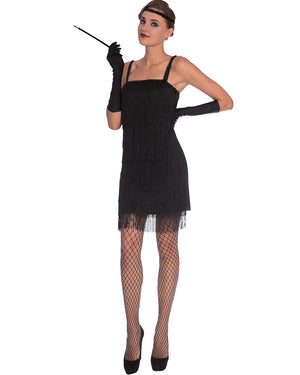 Step back in time to the roaring 1920s and embrace the spirit of the fabulous flapper with our Black Flapper Womens Costume. Get ready to dance the night away and make a dazzling statement in this dazzling number. This black dress features spaghetti straps and layers of black fringe, perfect for Charleston dance moves. Complete your glamorous look with the matching black sequin headpiece and a pair of black elbow length gloves, exuding an air of vintage elegance. Whether you're channelling the spirit of Gatsby or attending a 1920s themed party, this costume is sure to make a statement.