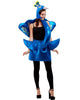 Peacock Deluxe Womens Costume. Featuring a blue satin peacock skirt styled with a blue hood, long plush neck and an attached long neck. The tail can be flipped as a peacock tail.