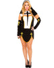 You'll need to confess some sins after wearing this gorgeous Bad Habit Nun Plus Size Womens Costume. The black dress features a white high neck collar, chest cut out, tulip skirt detailing, and gold trim. Stretching from the neck to the chest is a large black printed cross, set on a white panel on the bodice. This costume also comes with a black and white habit, black fingerless arm warmers with a gold cross print, and white thigh-high tights with a gothic cross print. Naughty but very, very nice.