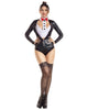 - Black and white striped vintage-inspired bodysuit with detachable clear straps.