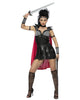 Prepare to conquer the arena in style with our Gladiator Deluxe Women's Costume! This isn't your average costume, it's a fierce ensemble fit for a warrior queen. Included is a stunning black gladiator style dress fitted with shimmering silver bra cups and attached black lappet belt that'll make you stand out in the Colosseum. Also included is the attached red cape that billows behind you as you make your grand entrance. A black body harness with layered shoulder shields adds an extra touch of badassery, while a black and silver headband and matching arm cuffs complete your warrior look. Whether you're battling beasts, foes or commanding armies, this costume will have you feeling like the ultimate goddess of the arena. Grab your sword, raise your shield, and get ready to unleash your inner gladiator!
