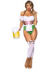 Turn heads and steal hearts with this Flirty Fraulein Sexy Womens Costume. This all-in-one bodysuit combines the charm of a traditional Dirndl with a sultry twist, featuring a white peasant top with lace-up waist, halter tie back, and a cheeky green bottom. The bodysuit is adorned with floral accents, pink ribbons, and a playful mini apron. The look also includes white thigh-high socks, adorned with floral ribbon accents, for a touch of sweet sophistication. Become a true Bavarian babe at your next Oktoberfest event or German themed party.