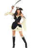 Don't just sail the high seas, own them in this Flirty Pirate Captain Womens Costume. This costume features a stunning black and ivory halter-neck dress, featuring a frill and gold-trimmed neckline that draws every eye. The structured bodice is accented with gold button detailing, while the layered ruched skirt features an adjustable tie, allowing you to show as much (or as little) leg as you desire. To add a touch of colonial elegance, the set includes ivory long sleeves with romantic ruffles and ribbon accents. The final touch is a black pirate hat dripping in gold trim and delicate lace, ensuring everyone knows who’s in charge of this ship. Ideal for costume parties, theatrical performances, or simply embracing your inner pirate.