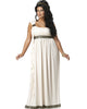 Embrace the grace and majesty of ancient Greece in our Olympic Goddess Womens Plus Size Costume. This stunning costume includes a cream coloured floor length gown that features a single shoulder strap design for a timeless silhouette. There is a metallic bronze filigree design around the waist and hem and ruching at the bust. To match the filigree look, there is an included round medallion to place on the shoulder strap and a gold headband with a double band design, perfect for crowning your goddess look. Complete the look further with accessories from our Greek range.