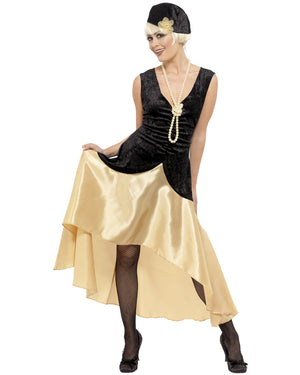 Join the decade long party in this 1920's style 1920s Great Gatsby Girl Womens costume. This great costume includes a dress with black velvet look bodice and gold satin effect skirt pearl necklace and matching hat with gold flower. Time to kick up your heels and bust out the Charleston.
