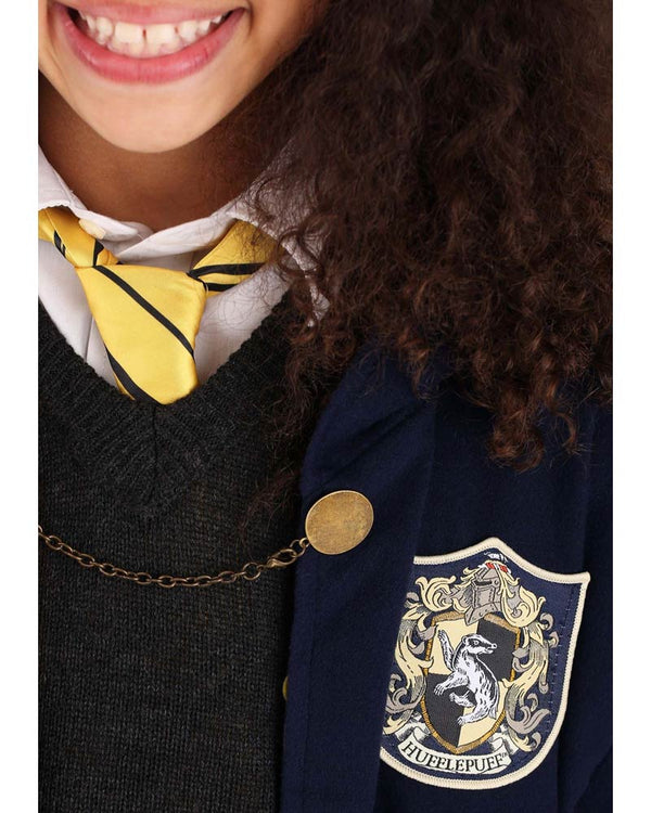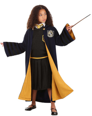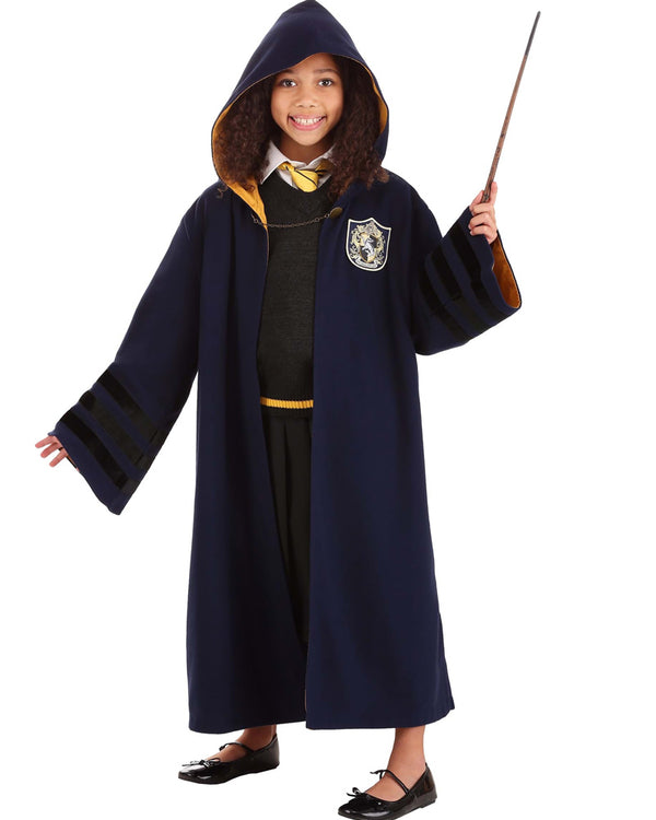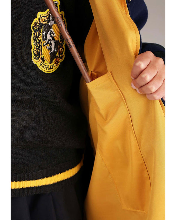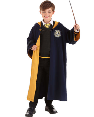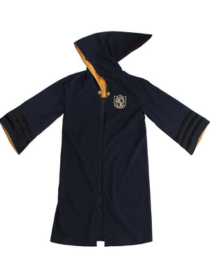 This Book Week dress up as our 1920s Hogwarts Hufflepuff Kids Robe. Featuring a fully lined dark blue hooded jumpsuit with a Hufflepuff patch, yellow highlights, an elongated hood, velvet stripes styled on the flared sleeves, and a fastener at the neck with a clasp. The costume comes complete with a sewn-in 25cm wand pocket to store your own wand. Finish your costume with our Hufflepuff tie and wands for a coordinated look.