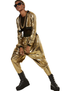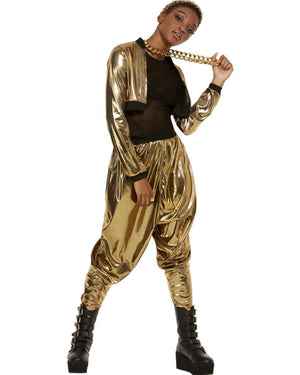 Prepare to bring the house down and bring the moves with this electrifying 1980s Hammer Time Women's Costume. Get ready to own the dance floor as you strut your stuff in this golden look that screams retro glam and attitude. Featuring a pair of loose-fitting, shiny gold pants with stylish ruching around the bottom, and a matching cropped jacket with a black collar, cuffs, and hem, this outfit is pure disco dynamite. The look comes complete with a sultry mesh black top and a sassy black bralette for a touch of edge and allure. It's time to break out your best moves and show the world what you're made of. Stop! Hammer time!