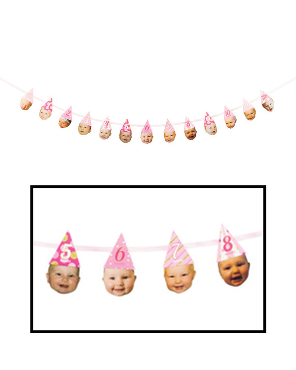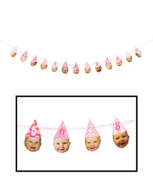 Celebrate your little girls first birthday with this adorable 1st Birthday Pink Custom Photo Hat Banner. This banner features a string of 13 photo frames to insert pictures in. Combine with our range of 1st Birthday Pink party supplies for a coordinated party look.
