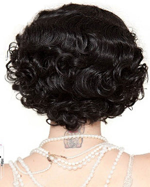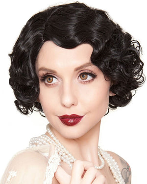 Say goodbye to drab lifeless hair and bring some jazz to you next 1920s outfit with this Flapper Finger Premium Black Wig. This gorgeous short wig is styled with classic finger waves that were so popular in the 20s and 30s. Wear a wig cap for added comfort and to keep your own hair under wraps.