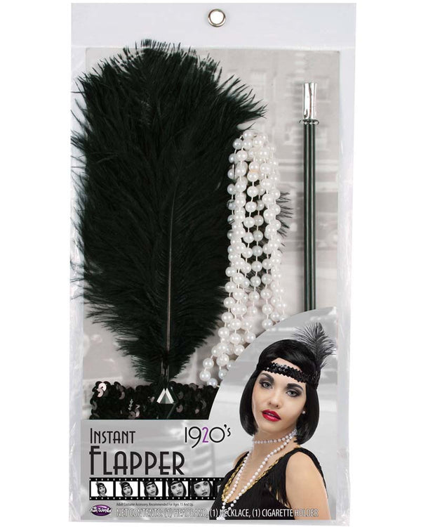 Add the perfect finishing touch to your flapper costume with this 20s Flapper Headband Necklace and Cigarette Holder Kit. This kit comes with a black sequin headband with a black feather and jewel, beads and cigarette holder.