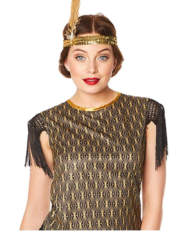 This 20s Flapper Womens T Shirt is a great quick and elegant way to dress as a 1920s flapper. The t shirt features an intricate black and gold pattern with metallic gold neckline as well as black tassel shoulder and hem detail.
