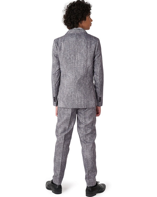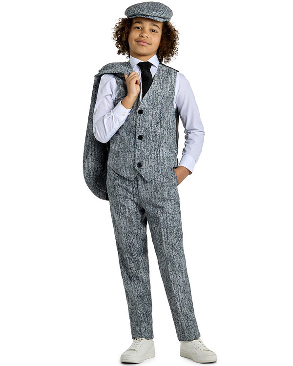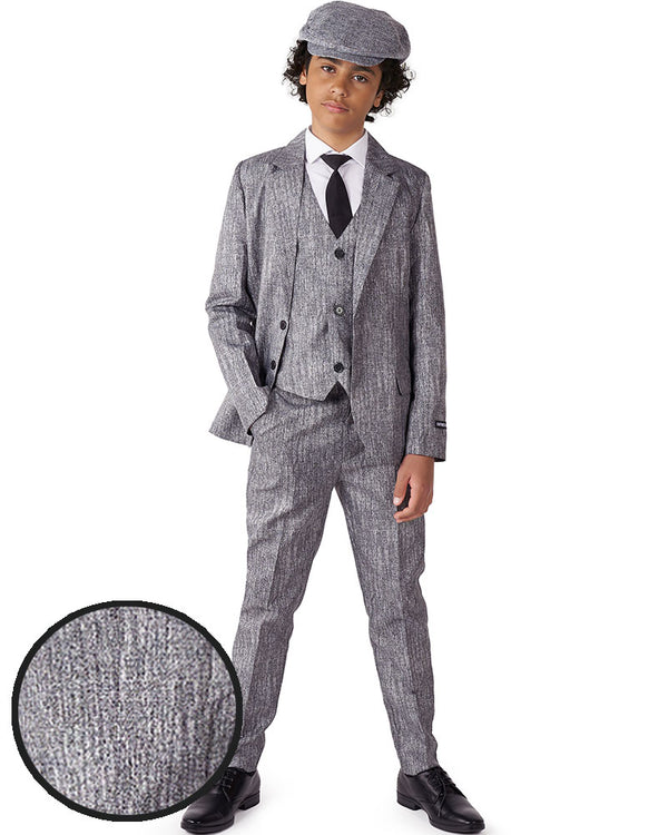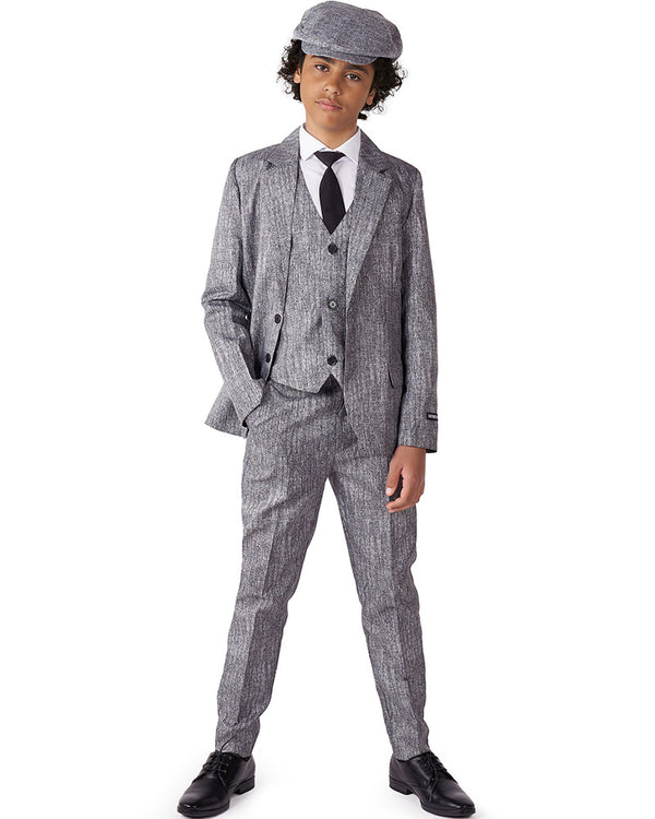 Run the streets of London in this sophisticated 20s Gangster Boys Suitmeister. The suit comes with a matching grey tweed jacket, pants, button up vest, newsboy style hat and an included black tie. Great for a Peaky Blinders costume or any 1920s dress up event. The jacket features two faux pockets on the outside and comes with a working inside pocket and the pants features two front pockets and one back pocket. If you’re unsure about sizes we recommend picking the larger size of the two suits as they come in a slim fit. All Opposuit pants and jackets are lined with a small amount of additional fabric so that if desired, they may be tailored to your exact length and fit by an alterations business or tailor. The waistband includes elastic to allow for automatic adjusting to suit the wearer.