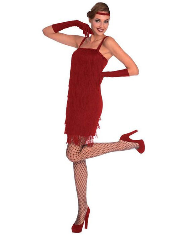 Add some glitz and glam to your wardrobe with our Red Flapper Womens Costume. This darling dress is the bee's knees, made with red fringed fabric that dances as you shimmy your hips. The flapper-style dress is simply divine, with a flattering waist silhouette and a playful fringed look that will have you doing the Charleston all night long. But that's not all. We've got you covered with a matching red sequin headband and matching elbow-length gloves. Perfect for 1920s themed parties, dress up events and much more.