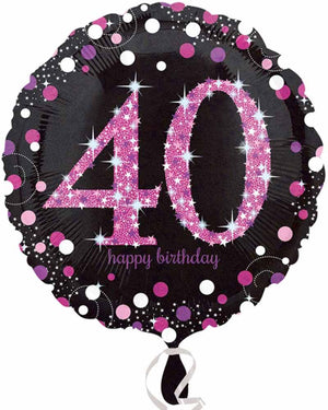 Celebrate your loved one's big birthday milestone with this 40th Sparkling Holographic Standard Foil Balloon. The balloon features the number 40 and the words 'Happy Birthday' written in pink with a holographic finish and an attractive border of holographic dots and stars in shades of pink on a black background.