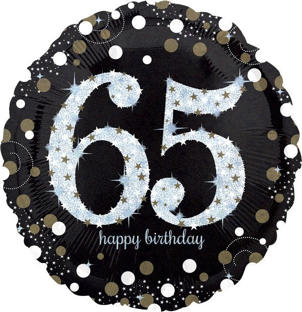Celebrate turning 65 with this glam 65th Sparkling Holographic Standard Foil Balloon. A black balloon with a large '65' in the centre with a sparkly gold and silver dotty border. The balloon measures 46cm and would make a great table centrepiece weighted with one of our balloon holders.