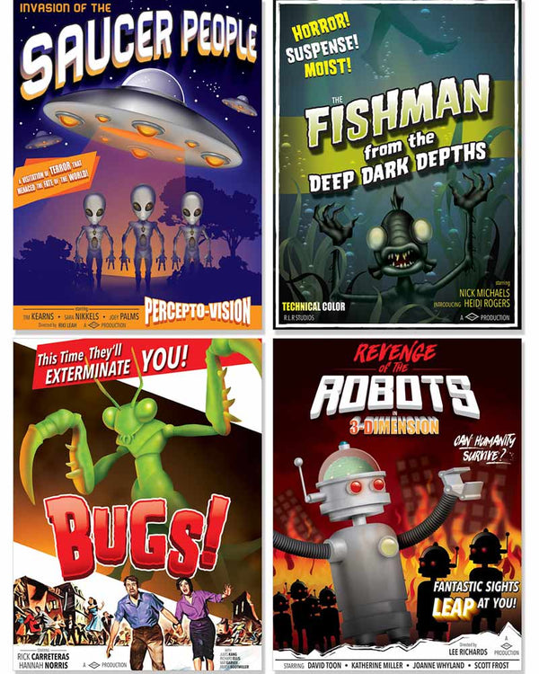 Set the scene for your 50s themed party with these 50s Movie Drive In Poster Cutouts Pack of 4. Included are 4 B-list movie posters of 50s inspired action movies.