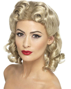 Get the forties look easily with this 50s Sweetheart Blonde Wig styled in the fashion of the day. Perfect for any of our WW2 uniform costumes Rosie the Riveter or retro glam looks. Wear a wig cap to keep your own locks under control.