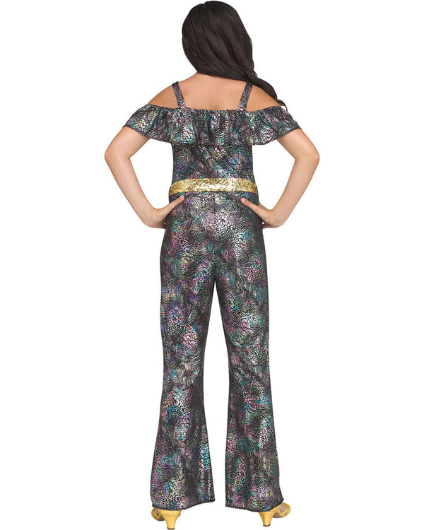 Tear up the disco dancefloor in this Disco Doll Girls Costume. The costume includes a jumpsuit with colourful metallic print as well as off the shoulder frill and shoulder straps. Also included is a gold sequin belt.