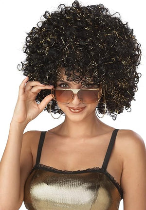 Get your disco groove on with this black with gold, glittery streaked wig. This Disco Glitter Wig in Black and Gold is the perfect accompaniment to any groovy costume. Wear a wig cap for added comfort and to keep your own hair under wraps.