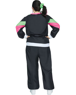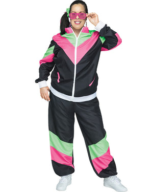You'll be rocking the trendiest tracksuit in town when you wear this 80s Black Tracksuit Plus Size Womens Costume! This costume is styled off the tracksuits popular during the 1980's and features a jacket and pants in a matching black, hot pink and neon green design. Deliciously daggy!